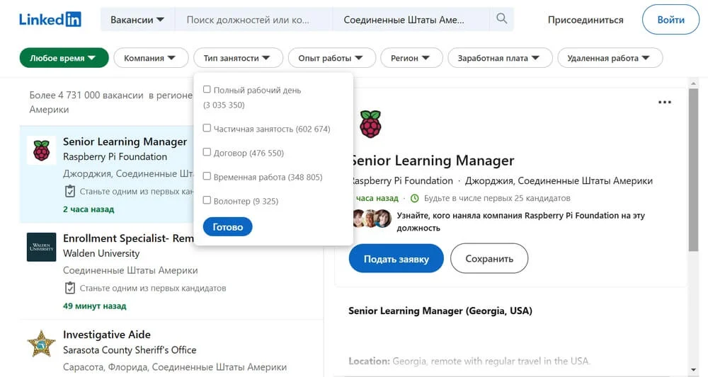 Представим, что мы хотим изучить вакансии за рубежом в сфере маркетинга, но не готовы к переезду и не уверены в своих навыках — аналитике, английском языке. Тогда на LinkedIn можно выбрать удаленную работу, частичный тип занятости и опыт — стажер и молодой специалист. Сервис отобразит начальные позиции с минимальным опытом для англоговорящего рынка.