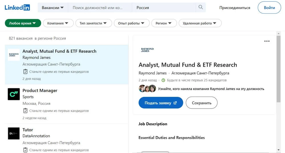 Однако, в LinkedIn можно найти и вакансию внутри России — сейчас здесь опубликовано 800+ вариантов. Привлекательно то, что на них мало откликаются — по всем позициям легко попасть в число первых 25 кандидатов.