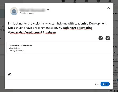Компания также может искать сотрудников с помощью постов — для этого в редакторе есть соответствующая функция. После заполнения небольшой формы с указанием сферы и должности автоматически отображается текст поста с хештегами и формой связи.