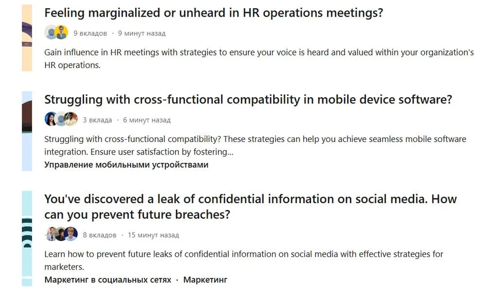 Для Top Voice нужно написать от трех экспертных комментариев к статьям одной рубрики в специальном разделе. Эта механика похожа на Яндекс Кью, где специалисты отвечают на вопрос и «растут» на этой площадке. В LinkedIn значок автоматически выдают, если мнение получило большинство голосов и попало в топ. Список тем обширный — от продаж и административных вопросов до инженерии, экологии и искусства.