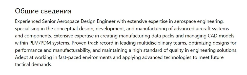 К разделу можно относиться как к набору SEO-слов и ключевых фраз — писать в формулировках, которые HR указывают при поиске кандидатов. Поэтому даже в общей информации нет места банальным стрессоустойчивости или коммуникабельности.