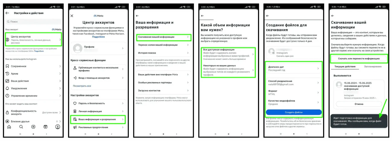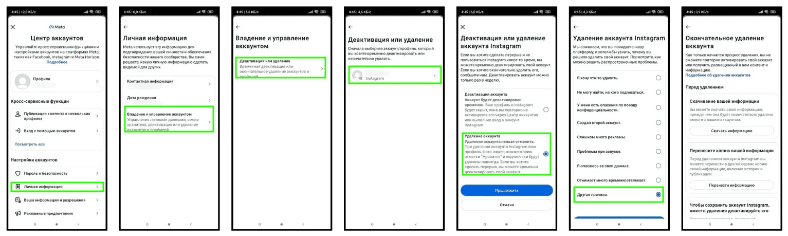 Перед удалением профиля необходимо сохранить важные данные (фото, видео, переписки), так как после окончательного удаления восстановить их будет невозможно. Instagram* предоставляет возможность скачивания данных через «Центр аккаунтов».
