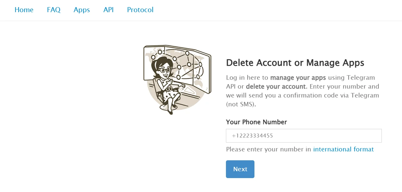 Откройте веб-страницу по ссылке https://my.telegram.org/auth?to=deactivate. В поле ввода укажите номер телефона, на который зарегистрирован аккаунт. Нажмите «Next».