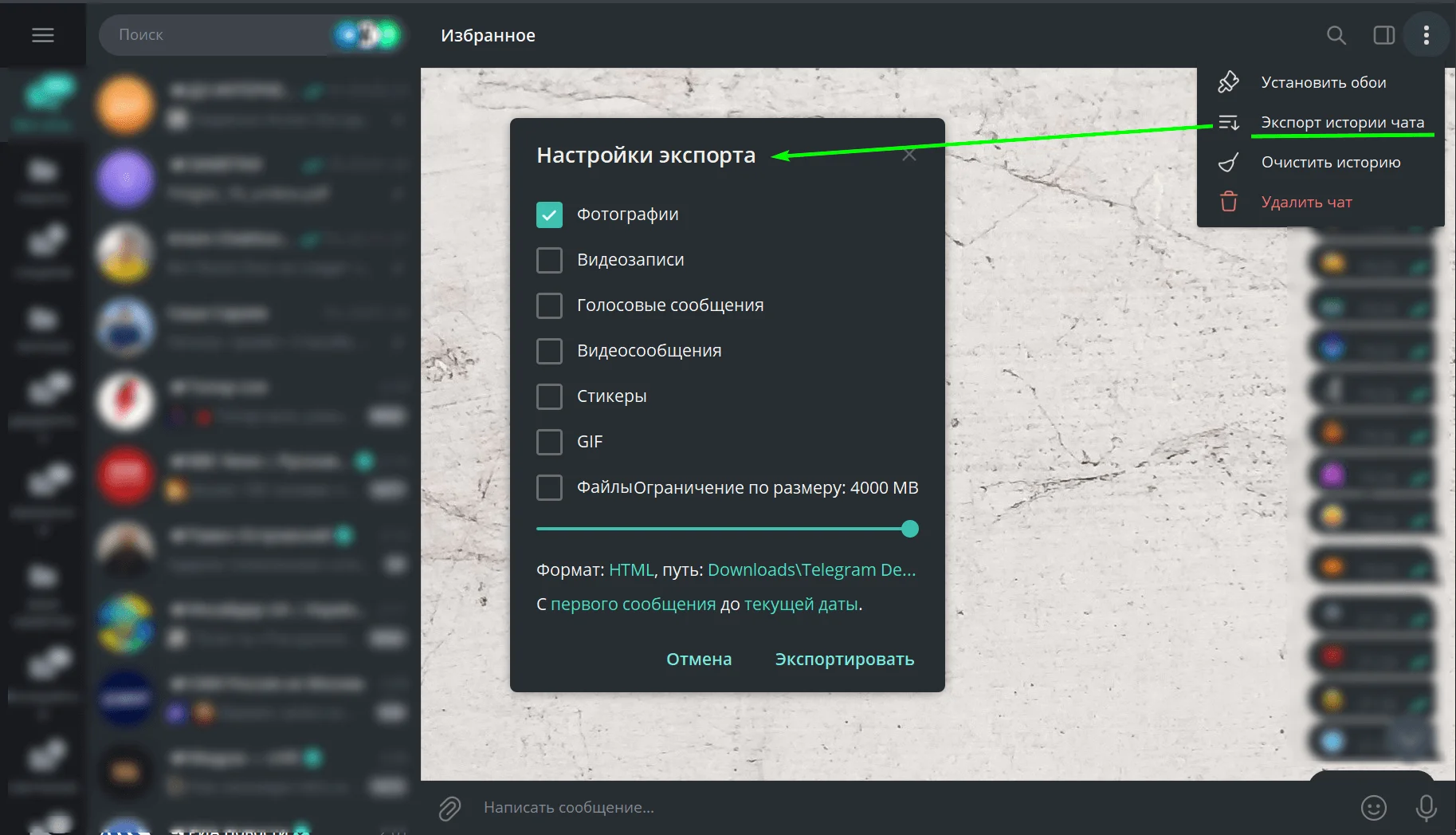 Таким же способом можно экспортировать историю отдельных чатов и каналов. Для этого откройте нужный аккаунт и в меню настроек (⋮) кликните на раздел «Экспорт истории чата». В открывшемся окне отметьте типы данных для сохранения. Дополнительно укажите формат сохранения данных, папку загрузки и период. Нажмите «Экспортировать».