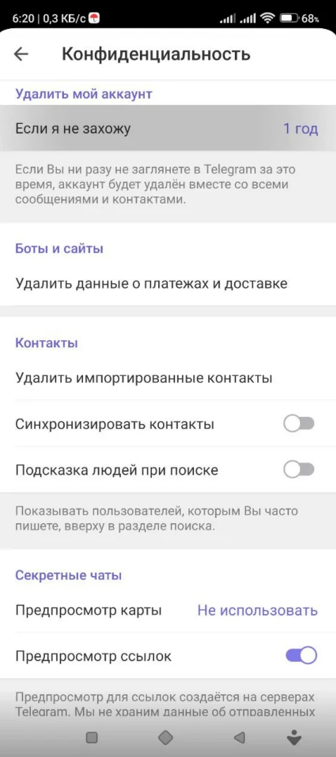 Если вы оплачивали через Telegram какие-то подписки или товары, то стоит удалить данные о платежах. Для этого: