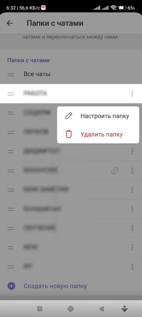 Удалить папки. В настройках меню найдите пункт «Папки с чатами» и кликните по нему. Выберите папку и нажмите на троеточие для вызова меню. В списке выберите «Удалить папку». В процессе удаления все чаты и каналы сохранятся, но без объединения в отдельную группу.