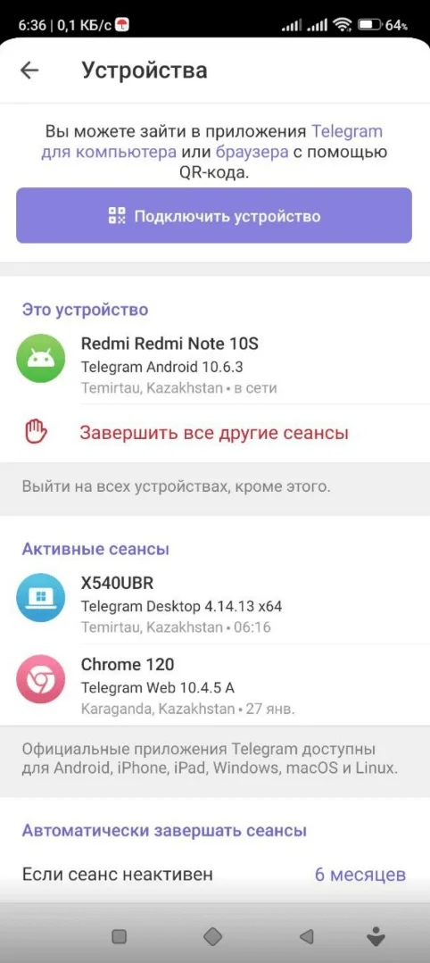 Завершить все сеансы на других устройствах. Из меню настроек перейдите в раздел «Устройства». Здесь вы увидите, на каких именно устройствах открыты сеансы на данный момент. Например, телефон, ноутбук, веб-браузер. Нажмите на «Завершить все другие сеансы», чтобы выйти из аккаунта на всех устройствах, кроме того, который вы используете прямо сейчас. Кстати, здесь же можно настроить автоматическое прекращение сеансов при неактивности от одной недели до одного года.