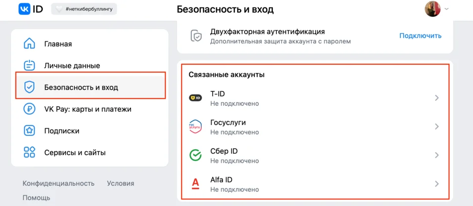 Чтобы сохранить доступ к сервисам, перед удалением профиля стоит добавить альтернативные способы входа, например, указать классический логин и пароль для авторизации или привязать другой аккаунт, Google или Яндекс.