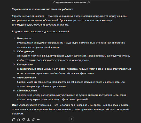 Управленческие отношения – это вид социальных отношений при организации совместной жизнедеятельности, представляют собой систему взаимных зависимостей и обязанностей, создаваемых для реализации управленческих функций.