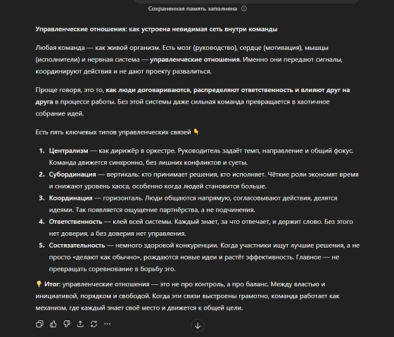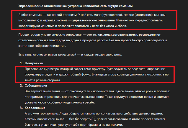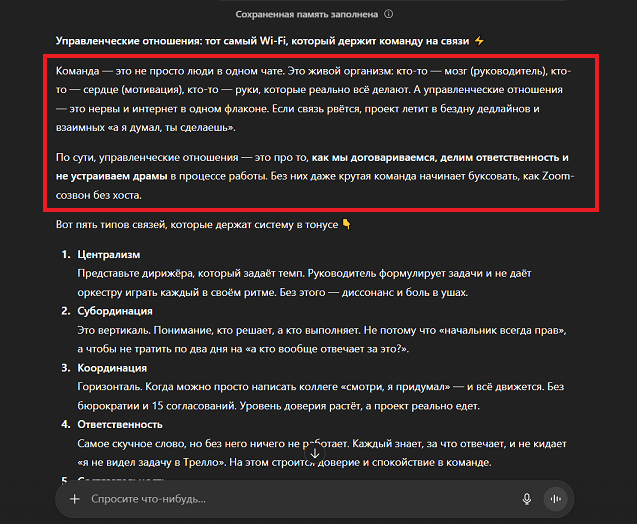 Сначала попробуем упростить и облегчить для восприятия исходный текст. Представим, что на его основе нам нужно написать статью в бренд-медиа. Материал будут читать digital-специалисты и предприниматели. Они могут знать основы менеджмента, но не любят академический стиль изложения. Попросим нейросеть адаптировать текст под нашу целевую аудиторию.