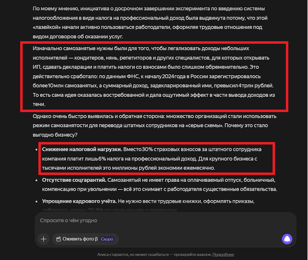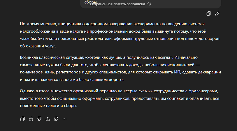 По моему мнению, инициатива о досрочном завершении эксперимента по введению такой системы налогообложения как налог на профессиональный доход, была выдвинута по той причине, что этой «лазейкой» начали пользоваться работодатели для оформления трудовых отношений под видом договоров об оказании услуг. Возникла ситуация «хотели как лучше, а получилось как всегда». Изначально, самозанятые необходимы для того, чтобы легализовать доходы всех небольших исполнителей: кондитеров, няней, репетиторов и прочих, для которых открывать ИП, сдавать декларации, платить налоги и взносы было очень дорого. Но по итогу множество организаций перешли на «серые схемы» работы с фрилансерами, вместо того, чтобы официально оформлять сотрудников, предоставлять им соцпакет, оплачивать все налоги и сборы.