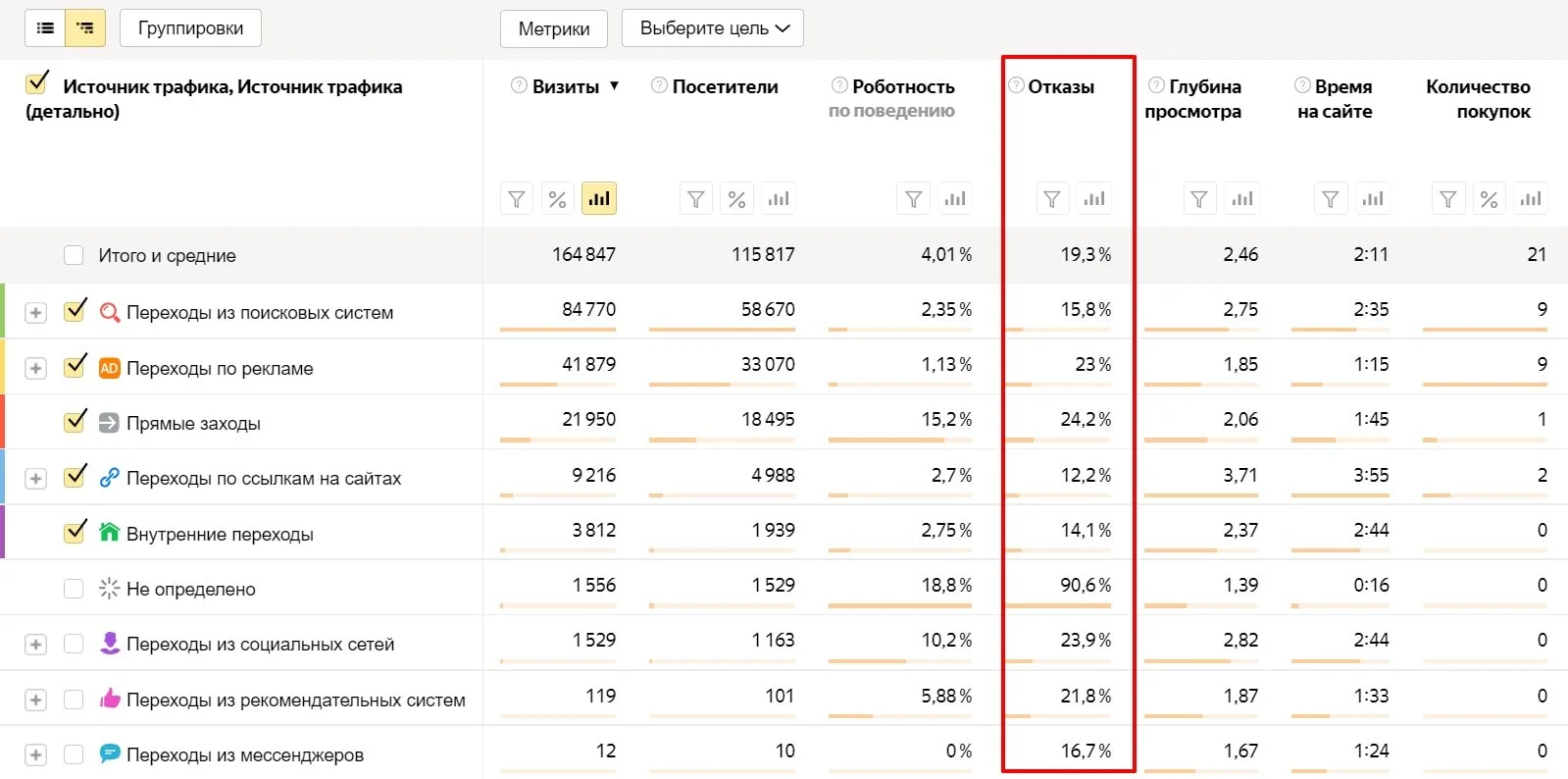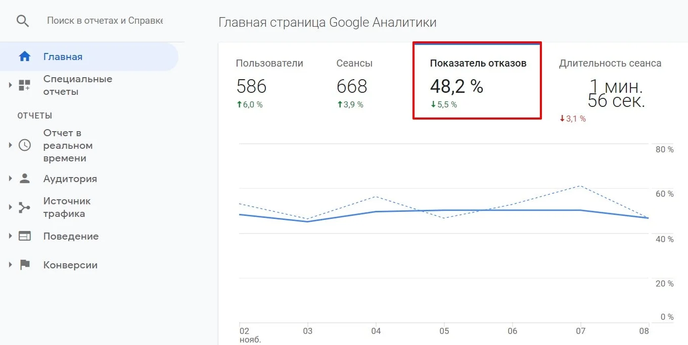 Для Яндекс Метрики рекомендуем придерживаться показателя 15%. В Google Analytics оптимальный процент отказов совершенно другой — для старой версии это примерно 35%. Что касается Google Analytics 4, то чем больше уровень вовлеченности, тем лучше.