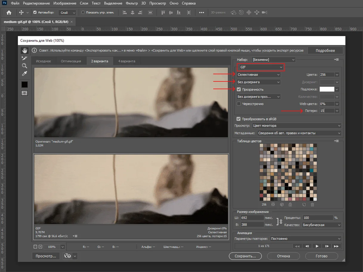 Откроется меню с кучей настроек. Сначала важно убедиться, что Photoshop планирует сохранить именно гифку: формат файла (GIF) будет указан вверху справа. Дальше можно пройтись по инструментам — на размер файла в первую очередь влияют:
