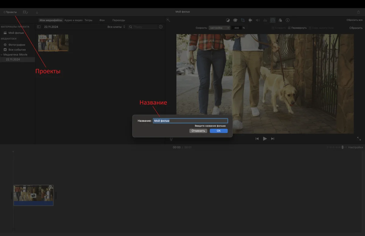 Чтобы сохранить файл, нажимаем на «Проекты» в левом верхнем углу. Появится окошко, в котором нужно ввести название видео.