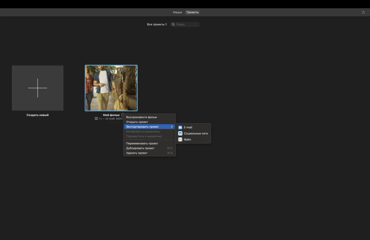 На скрине ниже — сохраненное видео на главной странице с проектами. Чтобы скачать, нажимаем плитку с фильмом и выбираем в меню «Экспортировать видео».