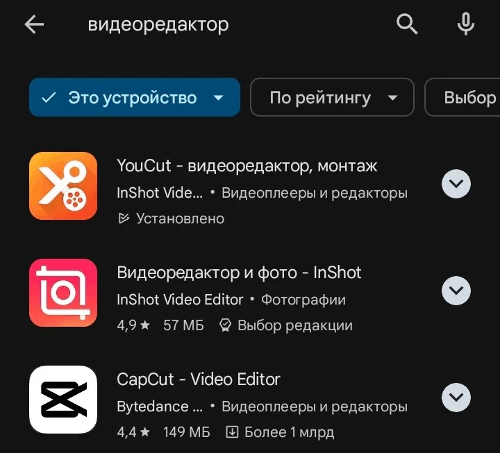 На Android нет предустановленного редактора, который умеет регулировать скорость видео. Поэтому придется скачать приложение из Google Play. Мы выбрали YouCut, так как у него более 100 млн скачиваний и рейтинг 4,9.
