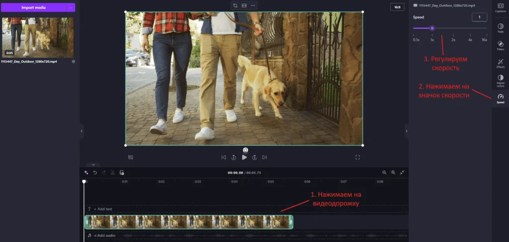 В центре рабочего пространства находится загруженное видео, а ниже — дорожка с кадрами. Нажимаем на нее, потом кликаем на значок Speed («Скорость») в меню справа. Откроется поле с ползунком регулировки скорости: от 0,1х до 16х. Это значит, что видео можно замедлить в 10 раз и ускорить — в 16. Шаг при замедлении — 0,1х, при ускорении — 0,01х.