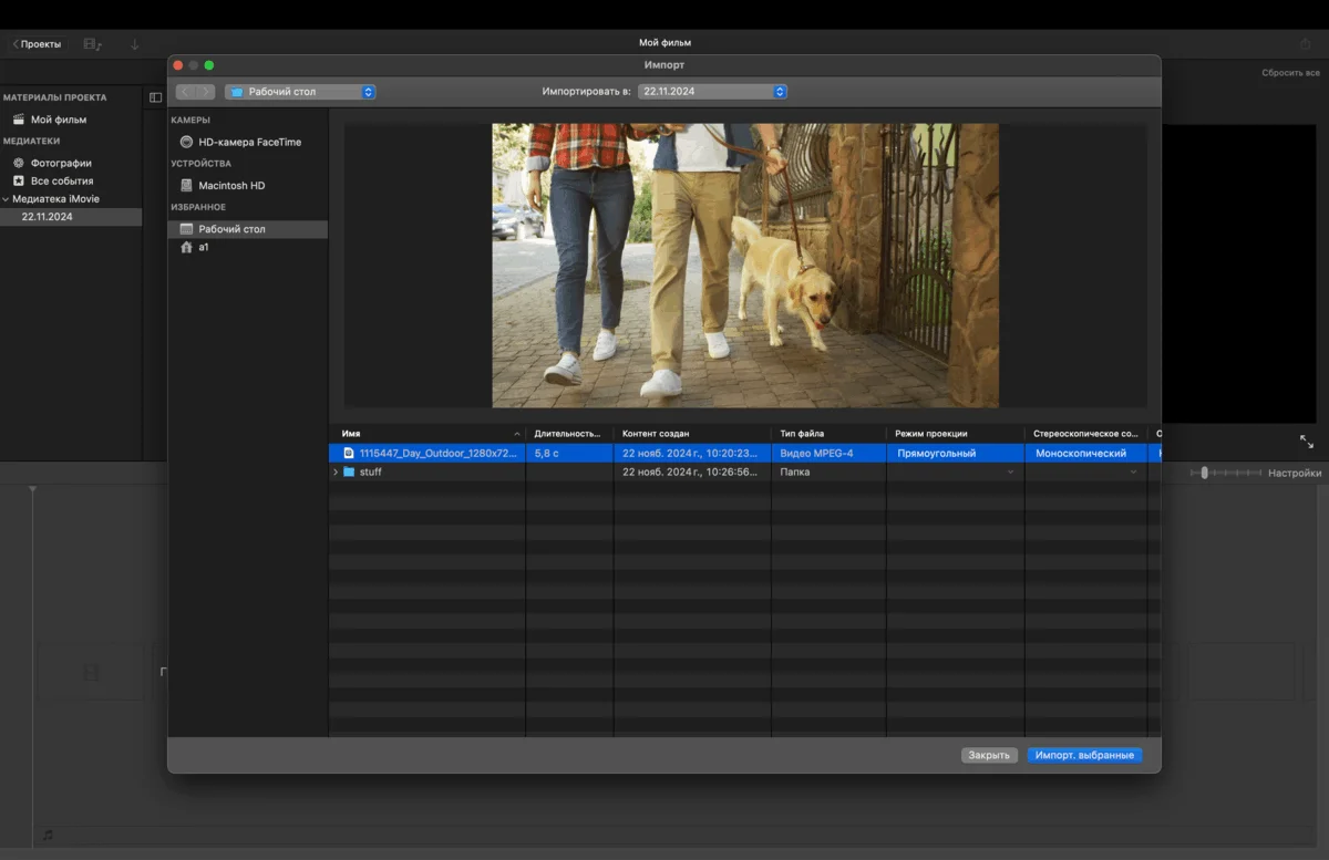 В открывшемся окне выбираем нужное видео, нажимаем кнопку «Импорт. выбранные» в правом нижнем углу.