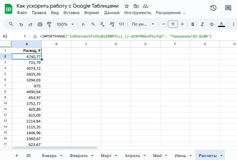 Также для лучшей производительности Google Таблиц стоит заменять длинные простые вычисления на встроенные функции. Например, вместо выражения =СУММ((A1:A10)/10) лучше использовать =СРЗНАЧ(A1:A10).