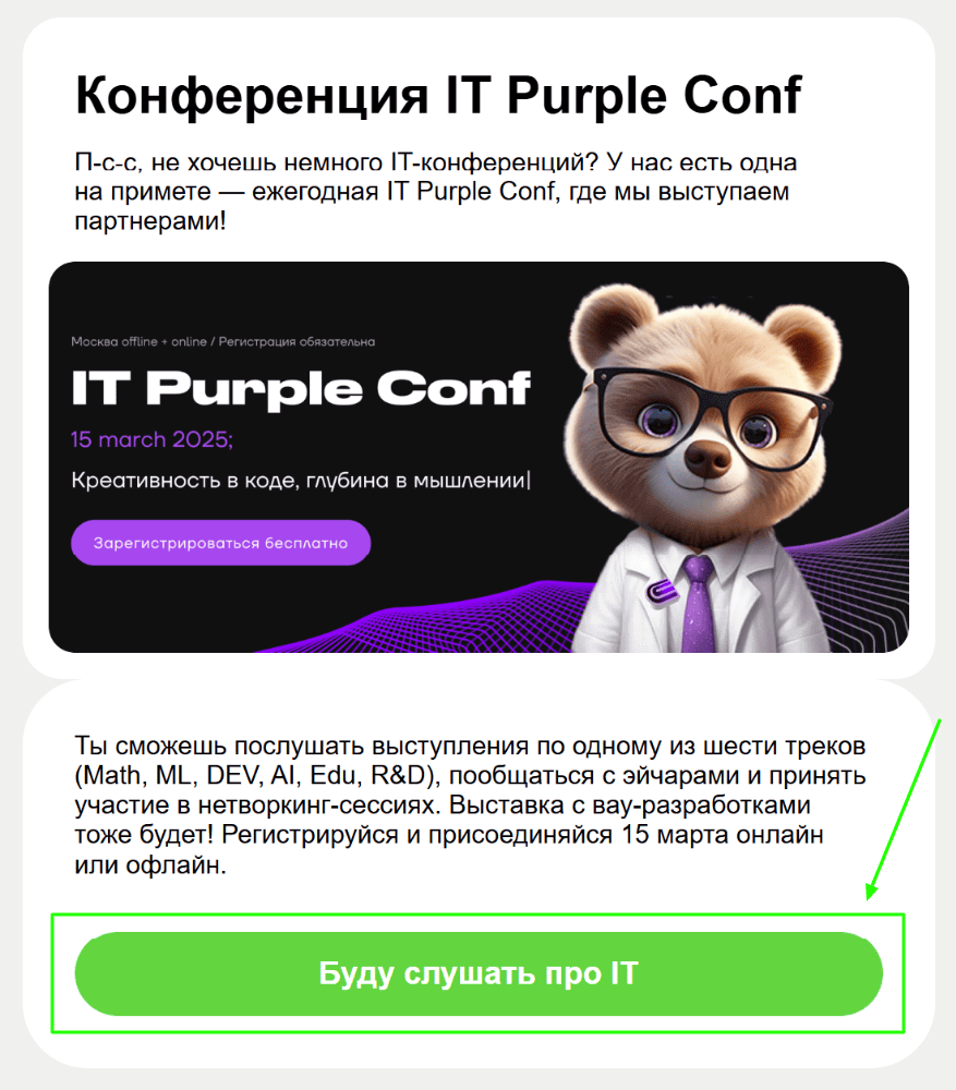 Призыв к действию (CTA) лучше оформлять в виде максимально заметной кнопки. Используйте контрастный цвет, который выделяется на фоне письма, но соответствует брендбуку. Кнопки лучше считываются и удобнее для нажатия пальцем на мобильных устройствах.
