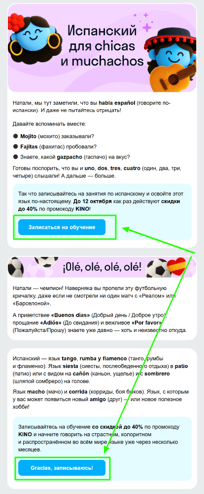 Ключевой CTA можно разместить в теле письма несколько раз (если это позволяет его длина). Пользователи прокручивают письмо с разной скоростью. Вы должны «поймать» их внимание там, где они готовы принять решение. Оптимально размещать CTA сверху (после первого абзаца), в середине (после ключевых аргументов) и внизу (перед подписью). В некоторых случаях и вовсе отлично работают кнопки, расположенные в самом начале, — разбирали такие кейсы в отдельном материале.