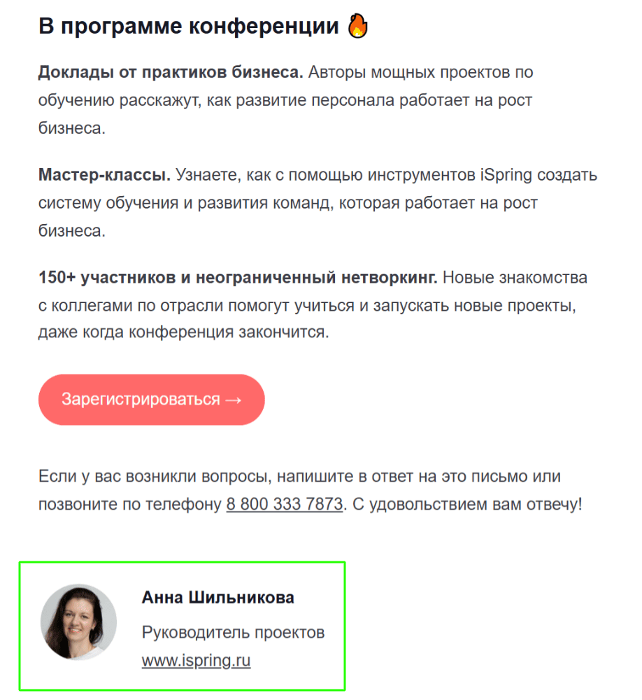 Если вы указываете подпись, то постарайтесь персонализировать её по-максимуму. Идеально писать от имени реального сотрудника (с указанием должности), поскольку это вызывает больше доверия и создаёт ощущение личного общения. Если же письмо исходит от имени бренда, указывайте полное и чёткое название компании.
