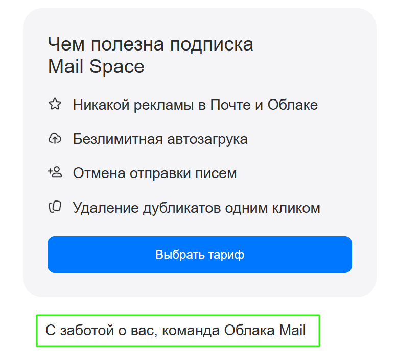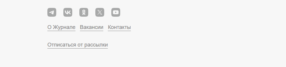 Футер (подвал письма). Нижняя часть письма, которая содержит вспомогательную и обязательную юридическую информацию, контакты и ссылки на соцсети. Также здесь должна присутствовать обязательная ссылка для отписки, что обеспечивает соблюдение правил рассылок.