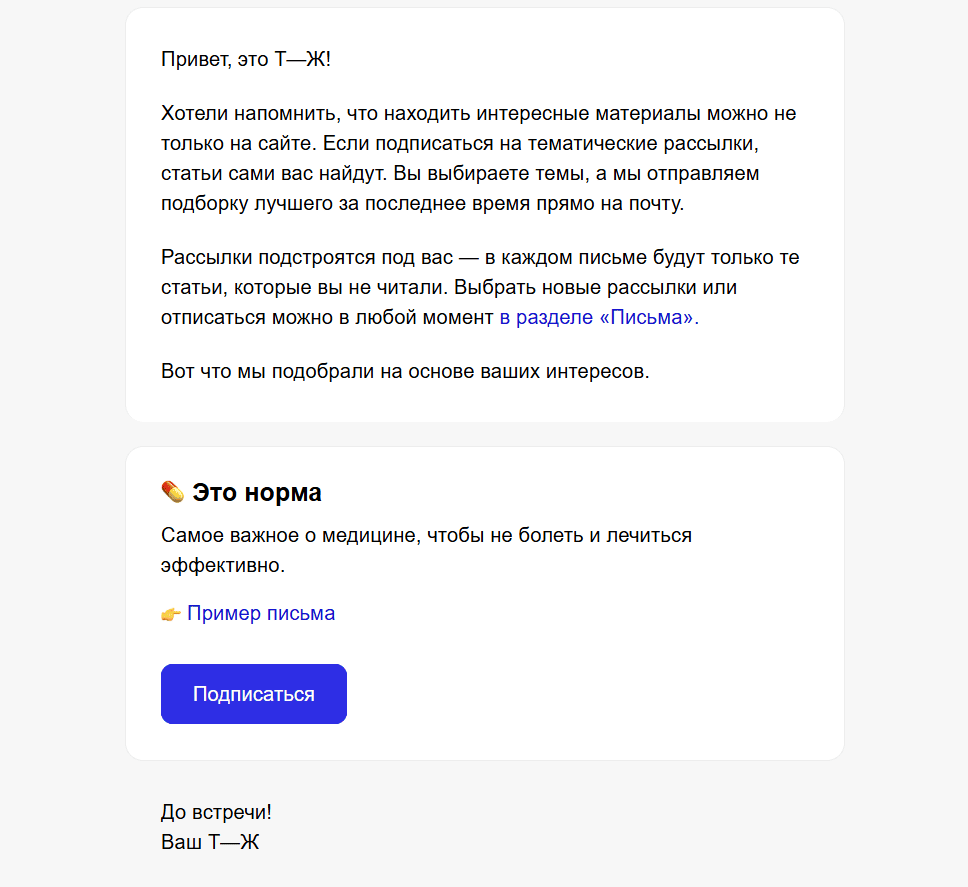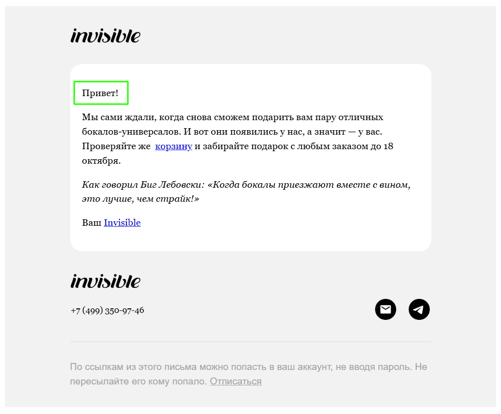 При этом в регулярных и автоматических письмах приветствие может отсутствовать. В таких случаях коммуникация начинается сразу с контентного блока, поскольку главная цель письма — быстро передать информацию или ценность, не отвлекаясь на формальности.