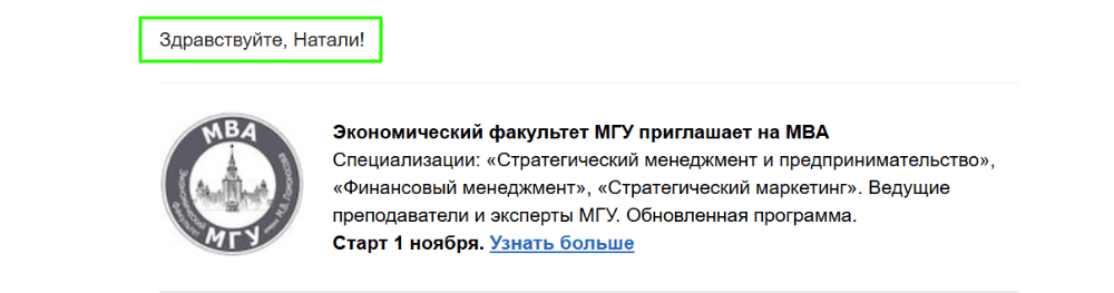 В email-рассылке приветствие приветствие желательно делать максимально персонализированным и вовлекающим. При наличии необходимых данных, старайтесь обращаться к подписчикам по имени. Это повышает открываемость и вовлечённость. Персонализированное по имени письмо воспринимается как личное, а не массовое.