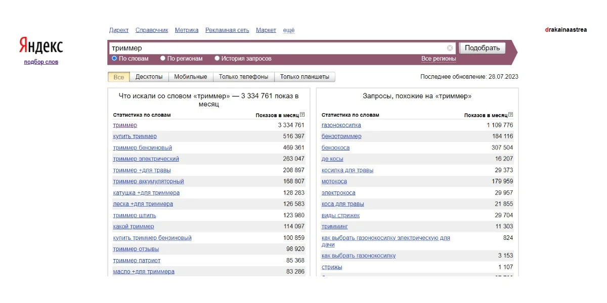 Такие запросы имеют широкую направленность. Внутри каждого обычно одно или несколько слов, которые пользователи наиболее часто используют при поиске информации. Их частотность — от нескольких десятков тысяч запросов в месяц.