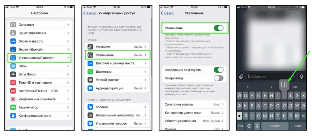 При включении функции Zoom можно увеличивать любую часть экрана, включая клавиатуру, коснувшись экрана дважды одновременно тремя пальцами. Это временное решение для ситуаций, когда нужно увидеть клавиши крупнее.