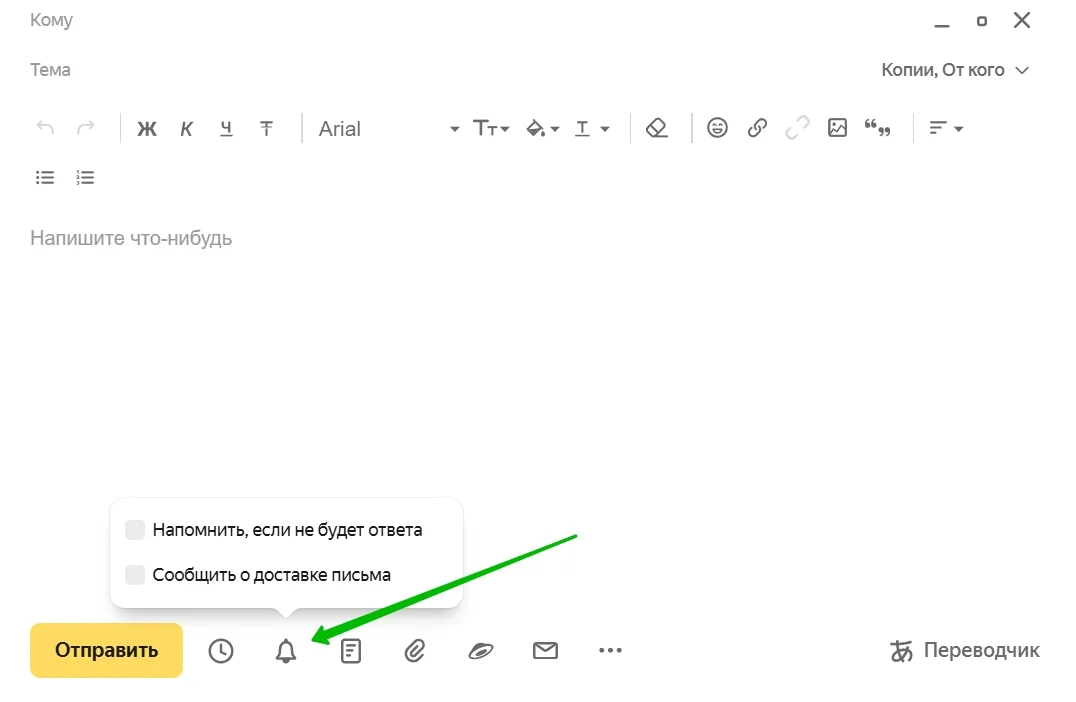 В Яндекс Почте есть встроенная функция уведомления о доставке письма и оповещения об отсутствии ответа — то есть можно отследить только доставку и наличие ответного сообщения. Для этого при отправке писем рядом с кнопкой «Отправить» найдите значок с колокольчиком и выберите нужную опцию.