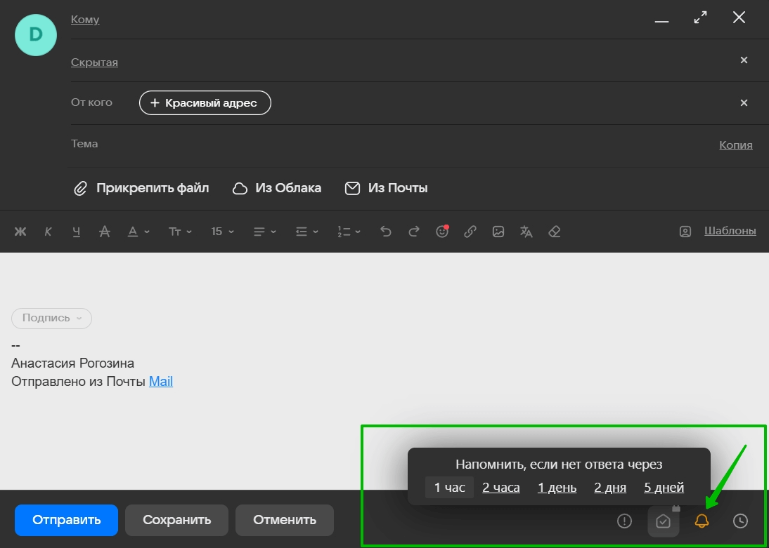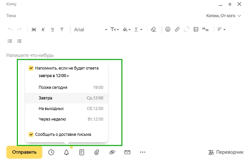 Если вы хотите включить напоминание об отсутствии ответа на письмо, нужно выбрать соответствующий пункт — вам предложат выбрать время, после которого придёт соответствующее напоминание.