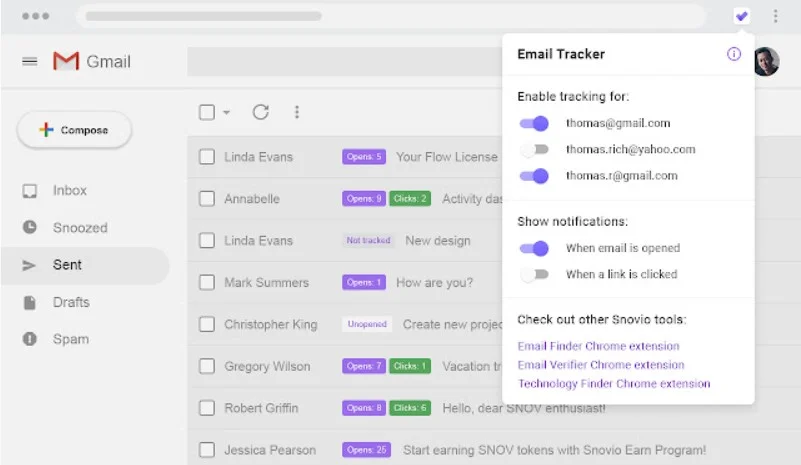 Бесплатный инструмент от Snov.io, с помощью которого можно отслеживать отправленные письма, переключаться между учетными записями Gmail, включать и отключать отслеживание прямо в расширении Chrome.