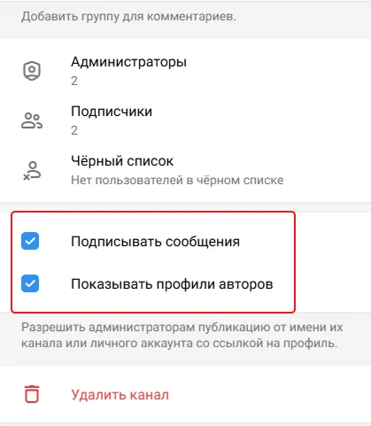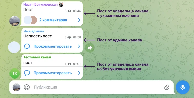 Так будут выглядеть посты от админа и владельца канала с указанием имени и без него.