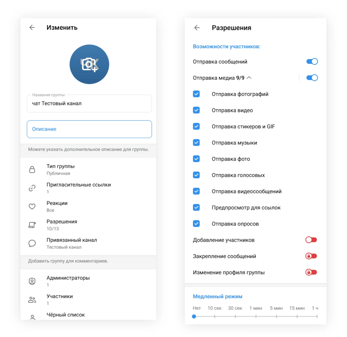 Возможности участников. Здесь можно, например, запретить отправку стикеров, гифок и медиафайлов — чтобы исключить спам в таком формате.