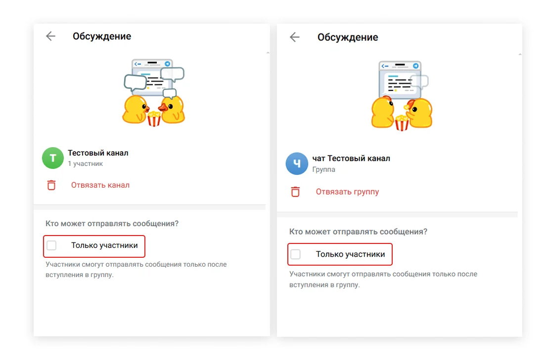 «Добавление участников» отключено по умолчанию, но в данном случае эта опция не имеет значения. Писать комментарии все равно смогут даже те, кто не подписан ни на канал, ни на привязанную к нему группу.