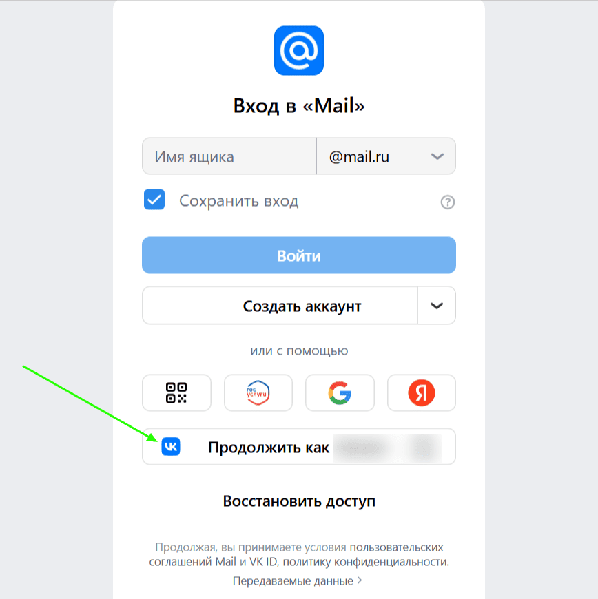 Для входа в почту нужно перейти на страницу авторизации с VK ID. Далее найдите значок ВКонтакте и нажмите на «Войти как…».