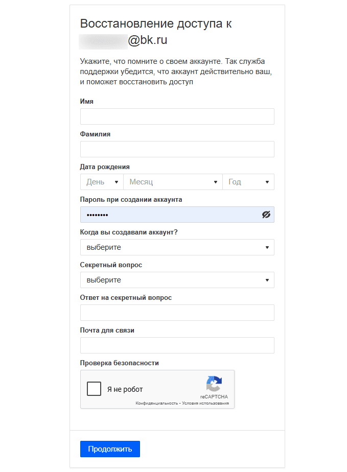 Учтите, что неверные ответы не отменят процесс восстановления доступа к аккаунту. Но старайтесь не пропускать вопросы и ответить на большинство из них. Однако если вы не помните ответ на какой-то вопрос, то просто пропустите его и переходите к следующему.