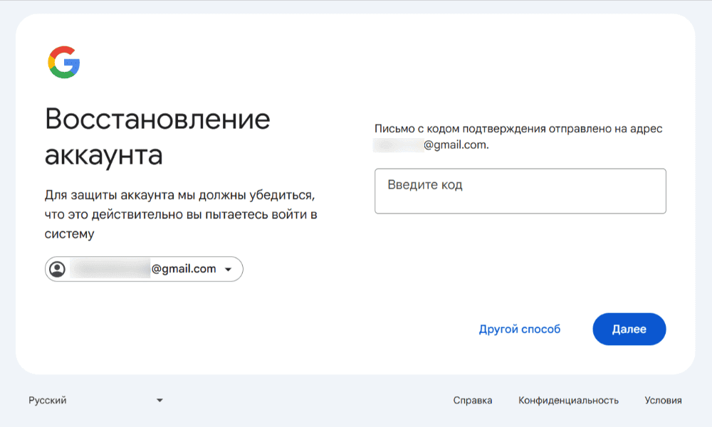 Важно. Google никогда не запрашивает ваши данные или коды подтверждения по телефону, электронной почте или в сообщениях. Также система не сотрудничает с сервисами, которые обещают восстановить ваш доступ или аккаунт. Вводите пароль или код подтверждения только на официальной странице восстановления.