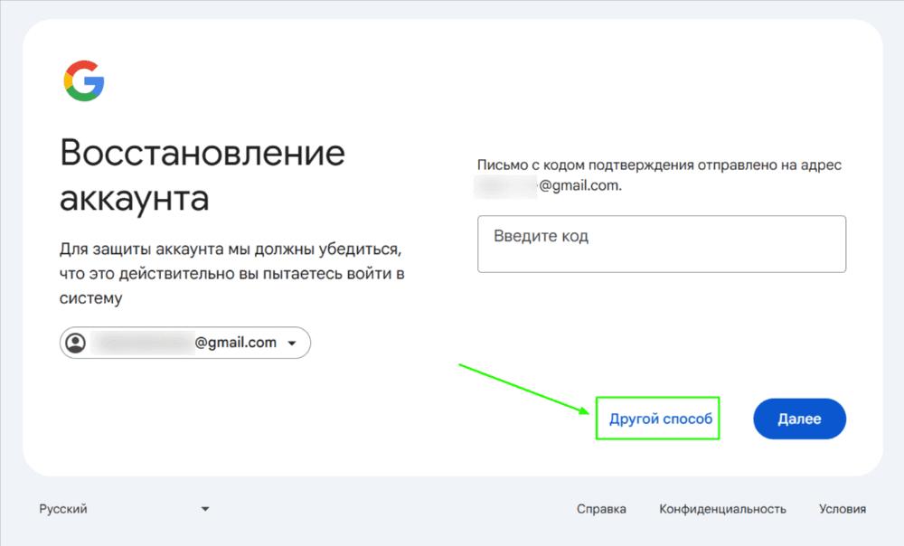 Когда система предложит отправку кода на email, кликните на «Другой способ».