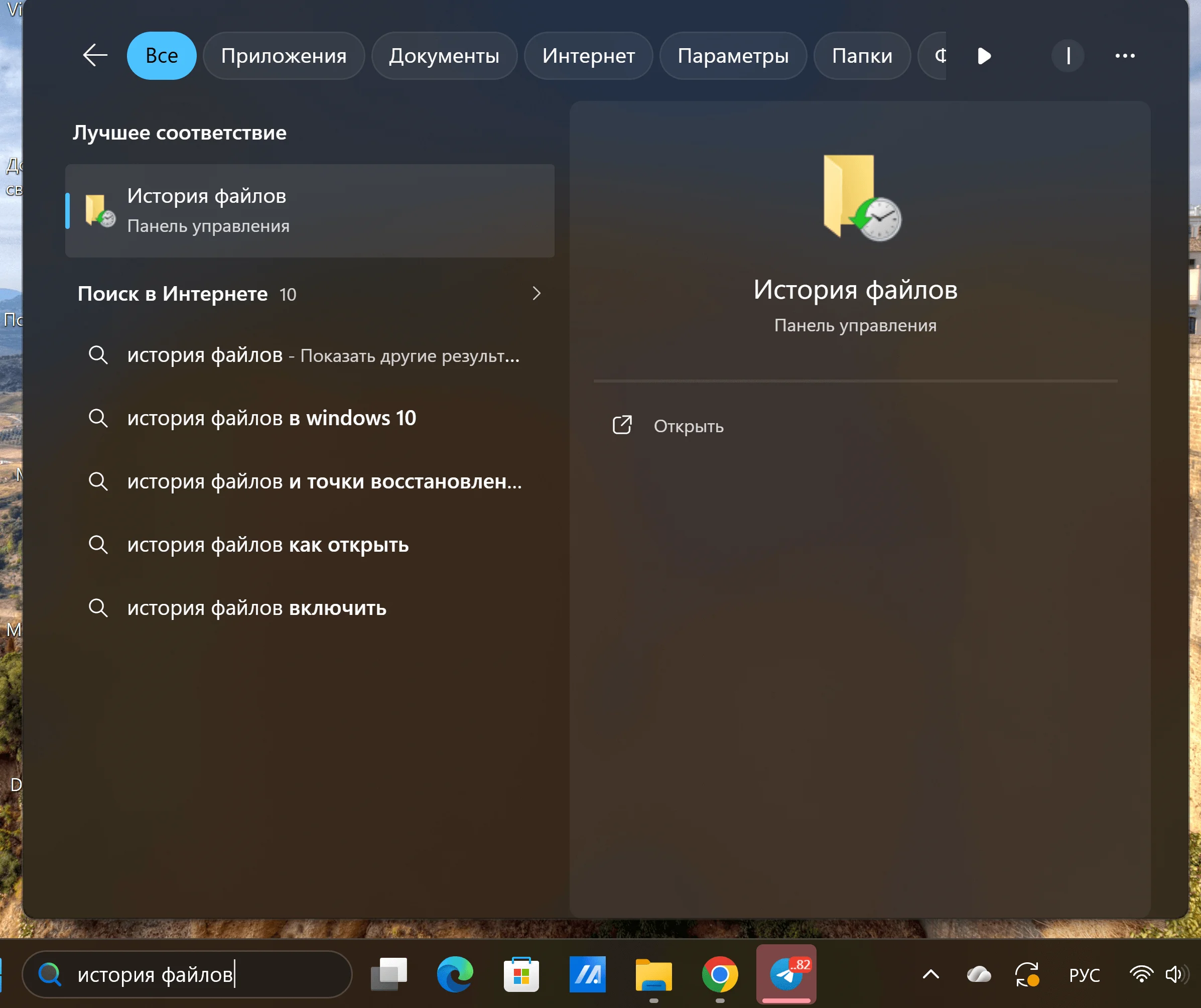 В Windows есть и более сложный инструмент, который создает резервную копию файлов на диске — называется «История файлов». Его можно найти в меню «Пуск».