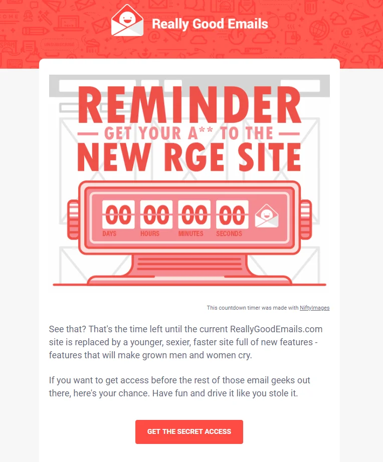 Как настроить. Такие счётчики обычно создают в специальных сервисах: Motion Mail или Sendtric. Really Good Emails из примера выше создали таймер в Nifty Images. В этих сервисах вы можете выбрать часовой пояс, дату окончания акции, задать фон и формат цифр. Всё это займёт порядка 10 минут. Таймер генерируется на сайте как гифка.