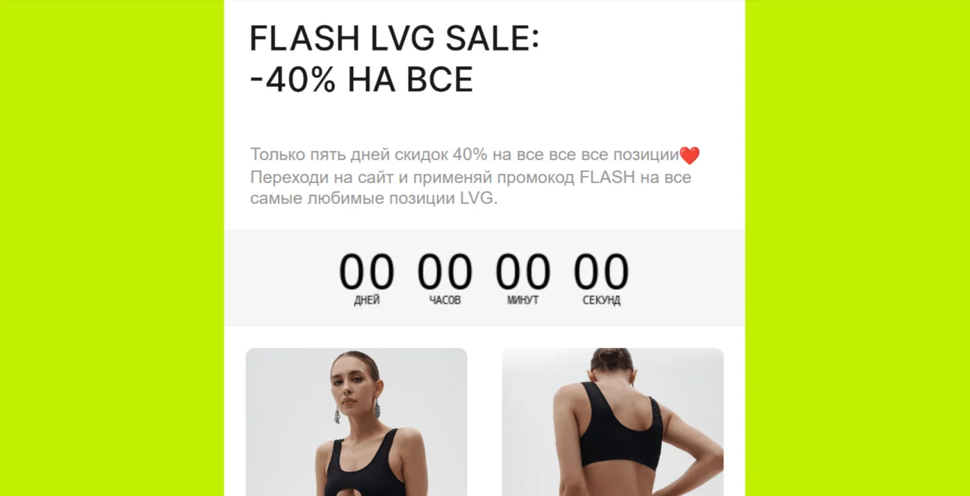 Действие промокода. При помощи таймера можно доступно показать пользователю, когда закончится действие его скидки или промокода. Но этот способ актуален только в том случае, если промокод краткосрочный и действует лишь несколько дней. В противном случае имеет смысл отправлять пользователю таймер не вместе с промокодом, а, например, за три дня до его истечения.