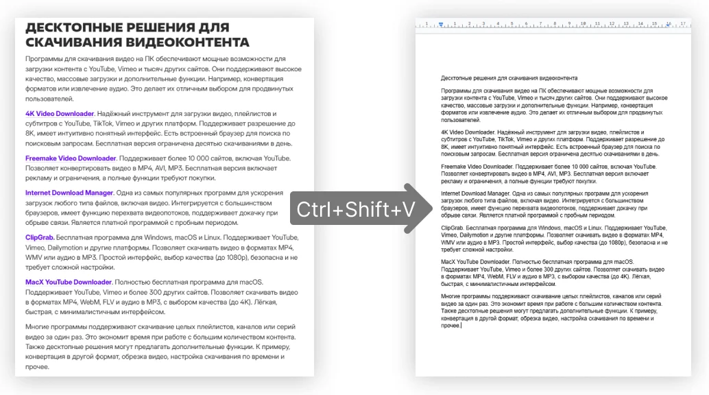 У любого цифрового текста — в документе, на сайте или в приложении — есть определённое форматирование. При копировании и вставке фрагмента в другое место также копируются элементы форматирования — разрывы строк, курсив и болд, размер шрифта, изображения, таблицы, гиперссылки и т.д.