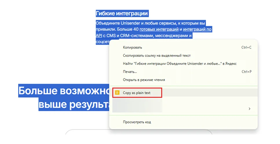 Copy As Plain Text. После добавления расширения в браузер в контекстном меню появится дополнительная строчка с логотипом и фразой Copy As Plain Text. Ничего дополнительно делать не нужно — копируйте нужный материал и вставляйте его куда угодно без форматирования.