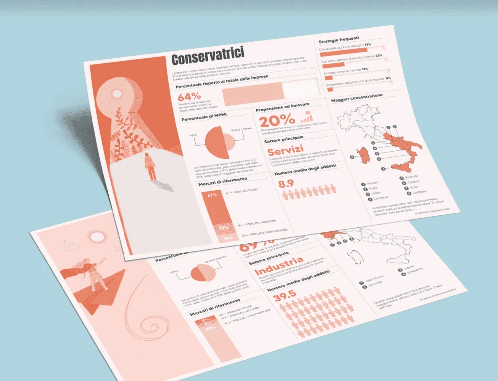 Пример инфографики-отчёта в печатном буклете, где есть пояснения к разделом, оформленные менее контрастным шрифтом, но читабельные и заметные: