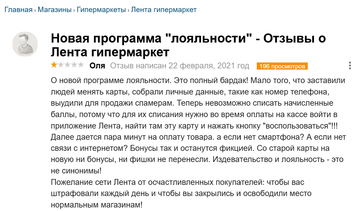 Пример. В 2021 году сеть магазинов «Лента» столкнулась с негативом покупателей из-за изменений в программе лояльности и необходимости менять карты. Оказалось, начисленные баллы списать при этом было нельзя: