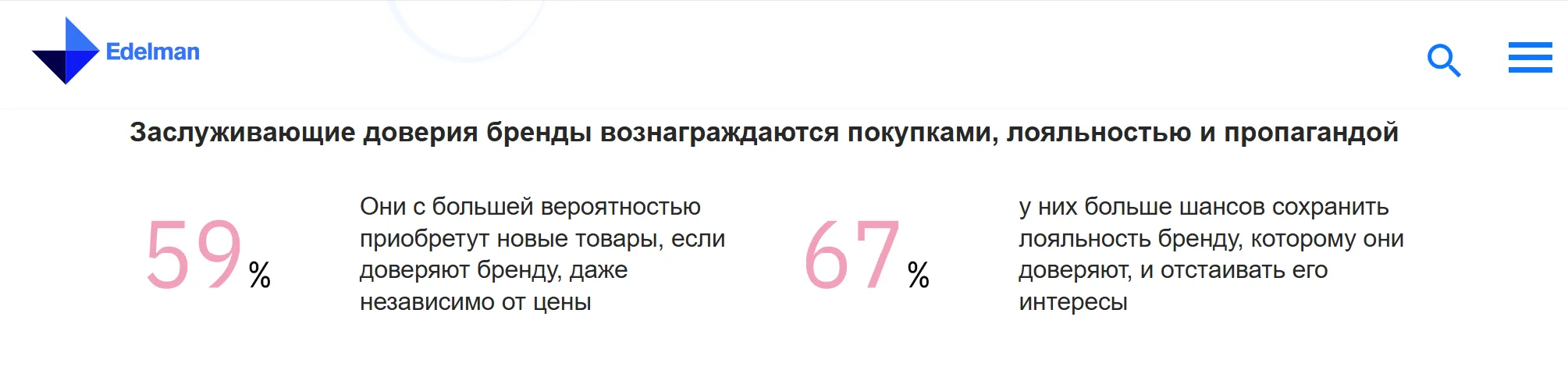 Репутационная стратегия включает в том числе улучшение продукта и сервиса с опорой на обратную связь, создание позитивного контента для формирования лояльности клиентов, работу с отзывами. Исследования компании Edelman Trust Barometer показывают, что, по мере роста лояльности к бренду, люди охотнее остаются с ним даже при репутационных промахах и росте цен.