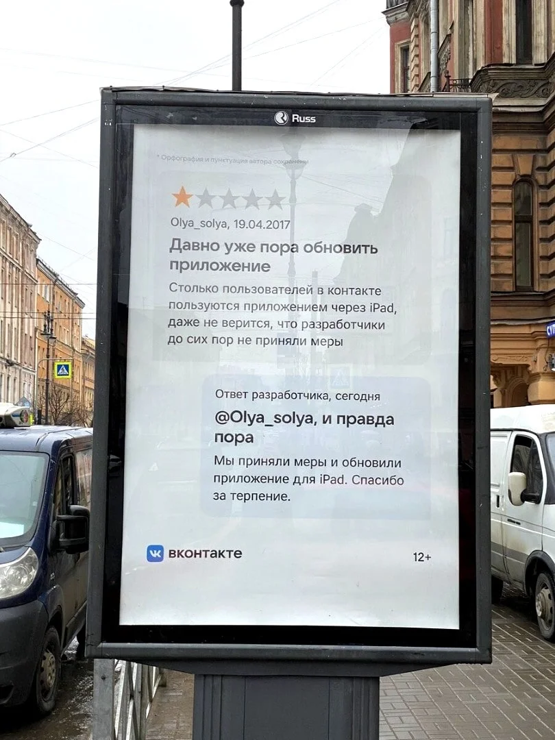 Также негатив можно обратить на пользу бизнесу, как в 2021 году сделал ВКонтакте. После обновления приложения, о чем пользователи просили в соцсети уже несколько лет, компания разместила такую наружную рекламу: